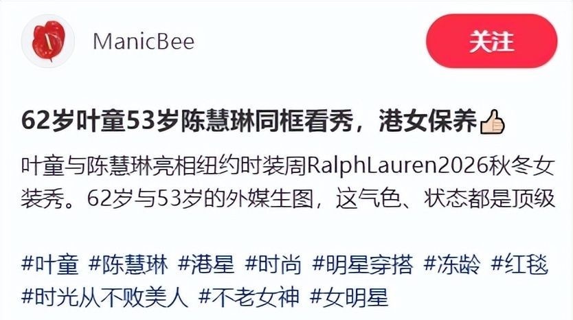 岁末将至,内娱热度持续攀升,国际时尚舞台同样精彩纷呈——纽约时装周秋冬女装系列于今日正式启幕,首日便引爆全网焦点,掀起一场关于年龄、审美与气韵的全民热议。